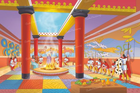 Antike griechische Karte mit Hoplit, griechischem Schiff und Löwentor in Myken